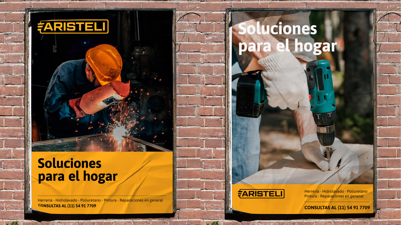 El diseño de Aristeli se basa en la pertinencia al perfil del sector. La tipografía robusta y geométrica remite a códigos visuales comunes en la construcción y ferreterías, mientras que las líneas gráficas integradas evocan movimiento y dinamismo, características reconocibles en el diseño industrial. Estos elementos hacen que la marca sea fácilmente detectable y asociable al mercado de reparaciones en Argentina, optimizando su impacto y capacidad de recordación.