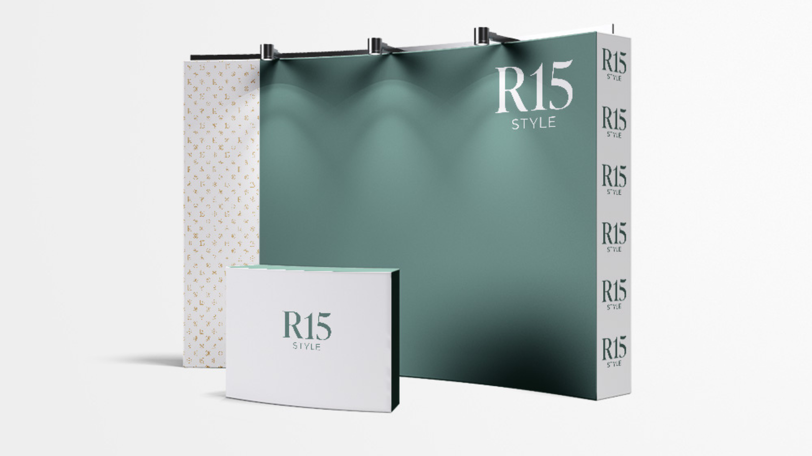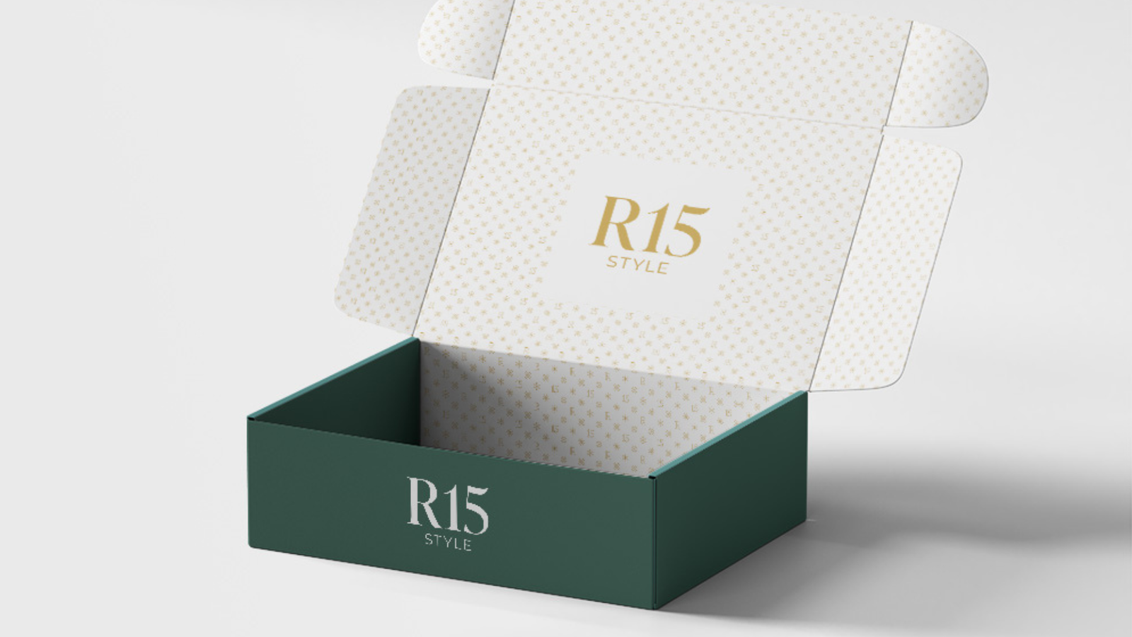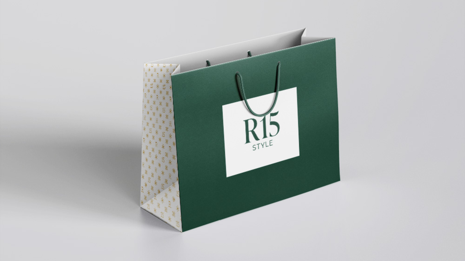 El rediseño de la marca se centró en destacar el nombre “R15” como el eje central de la identidad, simplificando la tipografía y ajustando los colores para reforzar su elegancia. La paleta cromática reducida a verde profundo, blanco y dorado se diseñó para evocar exclusividad y sofisticación, evitando combinaciones que diluyeran su impacto visual.